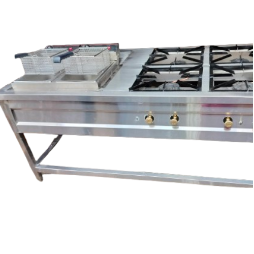 This combined unit brings together a powerful four-burner gas cooker and a double deep fryer in one stainless steel frame—perfect for high-efficiency commercial kitchens. Designed for speed, convenience, and performance, it allows simultaneous boiling, frying, and cooking, making it ideal for restaurants, hotels, and catering operations.